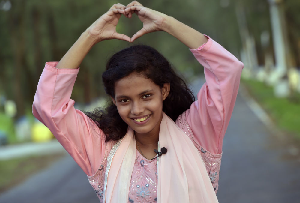 2023年5月26日,在孟加拉国首都达卡,阿利法·秦以爱心手势表达对中国的热爱。新华社