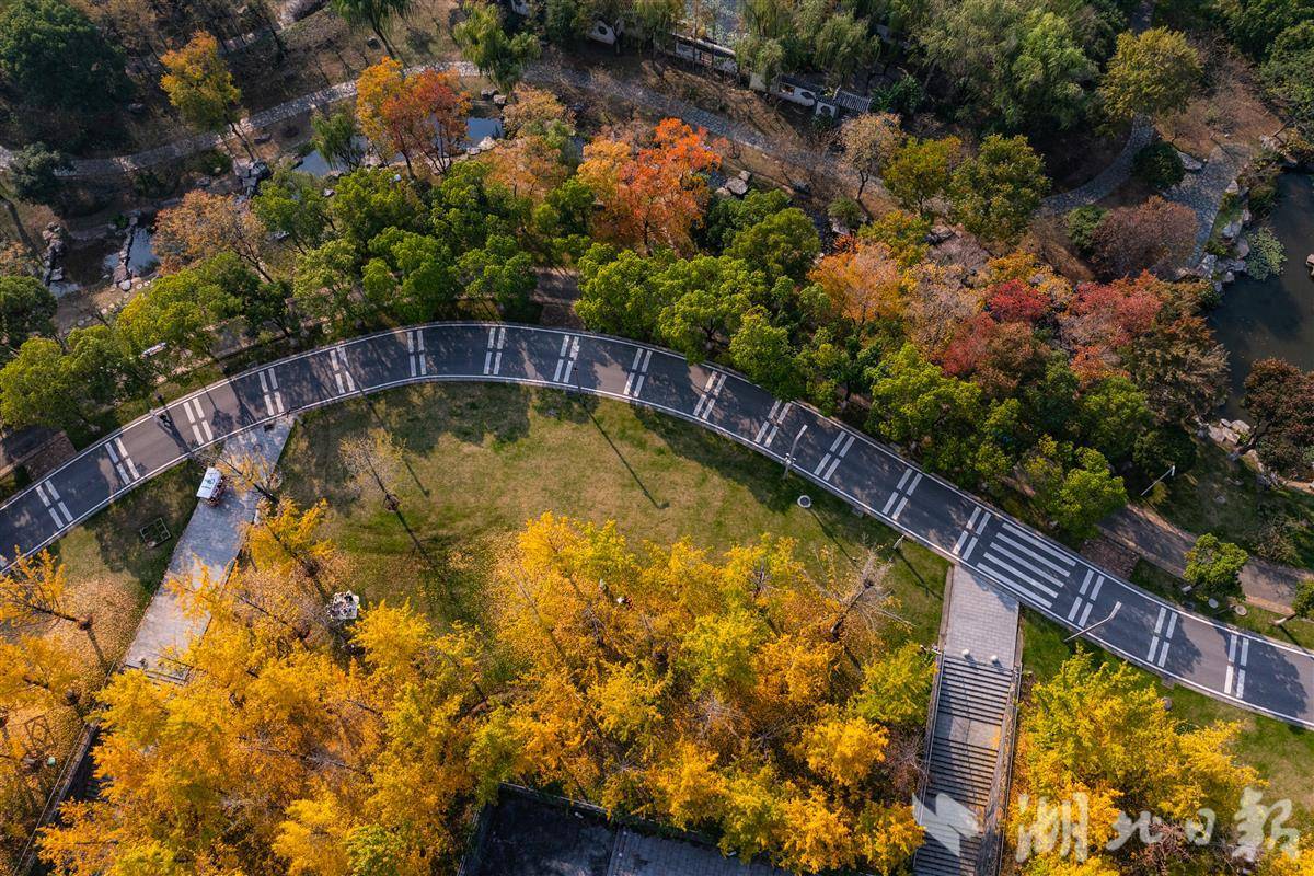 2025年11月14日,初冬的武汉晴空万里,园博园长江文明中心前的银杏树一片金黄。航拍中,金冠树如伞盖般起伏,落叶铺成的金色地毯一直延伸到远方。游客们抬头拍摄被照亮的树梢,走过铺满树叶的地毯,捕捉这座城市初冬的景象。 (湖北日报全媒体记者倪娜 通讯员徐志刚 严军 摄)
